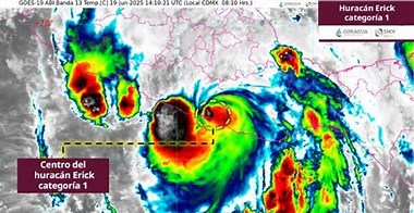 “Erick” se degradó a huracán categoría 1 en la escala de Saffir-Simpson y su centro de localizó en tierra aproximadamente a 50 kilómetros al nor-noroeste de Punta Maldonado, Guerrero, con vientos máximos sostenidos de 140 kilómetros por hora y rachas de 165 km/h, informó la Comisión Nacional del Agua (Conagua).