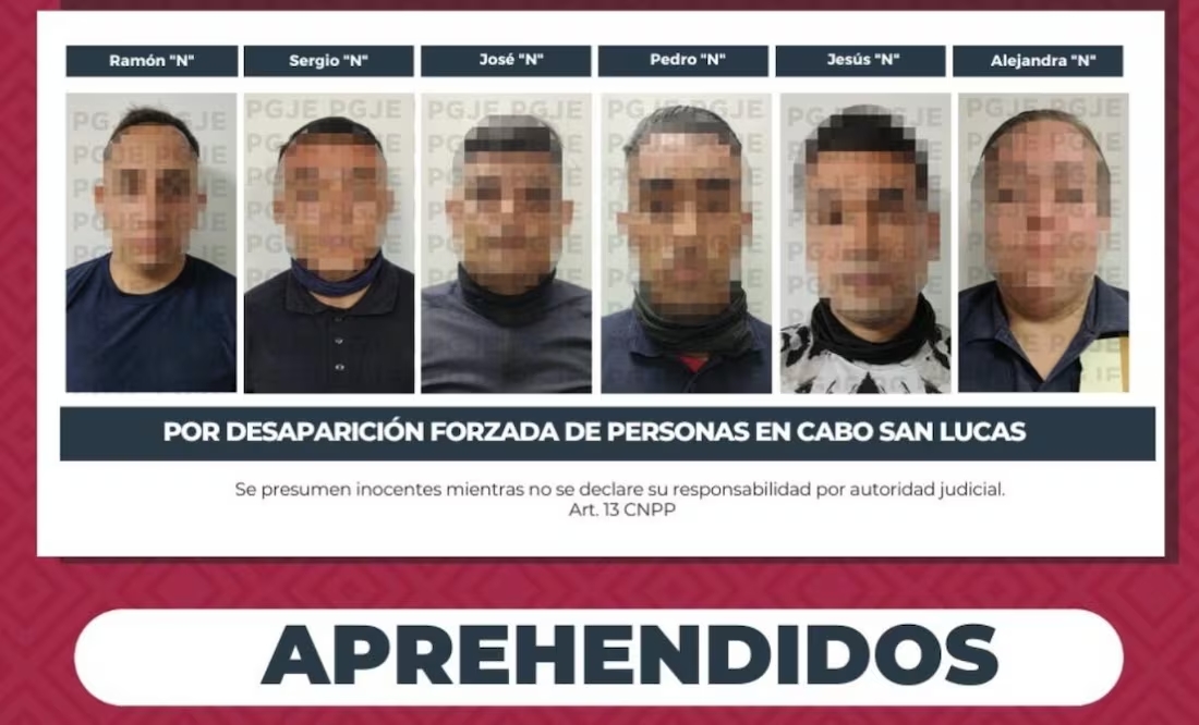 Autoridades aprehendieron a seis policíasmunicipales de Los Cabos, en Baja California Sur, a quienes se les investiga por su probable responsabilidad en el delito de desaparición forzada de personas, cometido presumiblemente contra dos jóvenes.