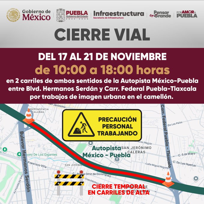 “CIERRE VIAL DEL 17 AL 21 DE NOVIEMBRE EN 2 CARRILES DE AMBOS SENTIDOS DE LA AUTOPISTA MÉXICO-PUEBLA ENTRE BLVD. HERMANOS SERDÁN Y CARR. FEDERAL PUEBLA-TLAXCALA.