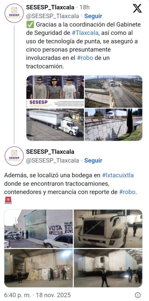 De acuerdo con la información difundida por la cuenta oficial del Secretariado Ejecutivo del Sistema Estatal de Seguridad Pública (SESESP) de Tlaxcala, la acción inició tras una llamada al 9-1-1 en la que una empresa reportó haber perdido contacto con uno de los operadores de uno de sus tráileres que transportaba mercancía diversa en San Martín Texmelucan.