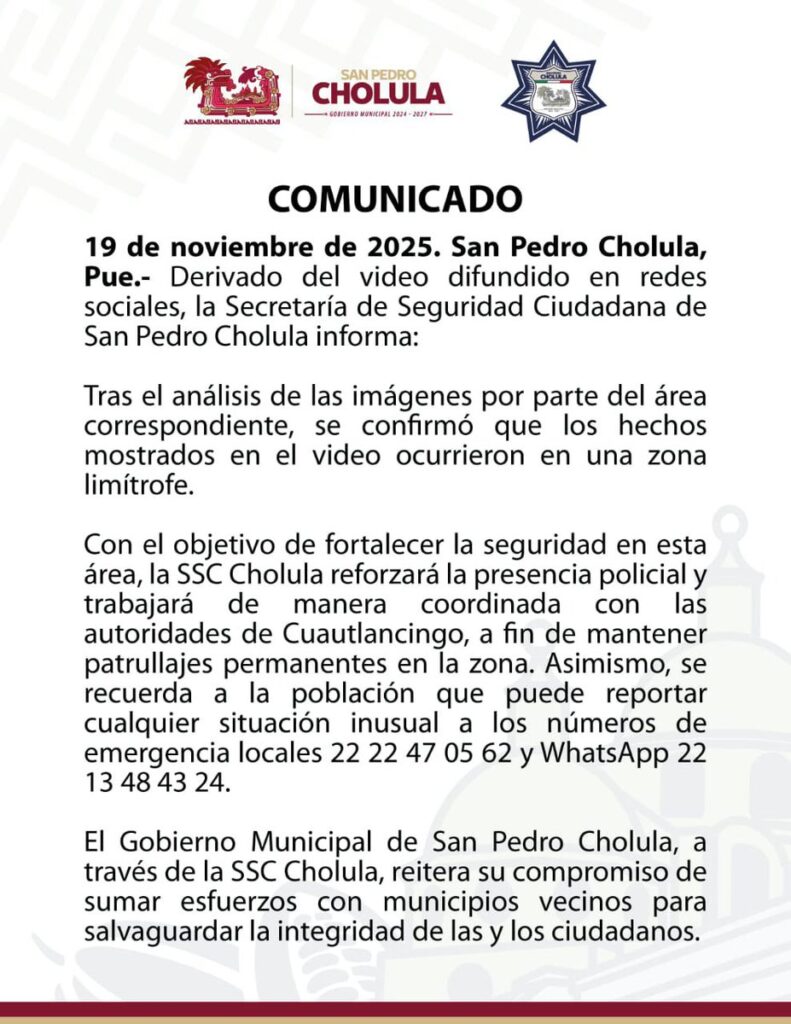 La SSC de San Pedro Cholula ya trabaja de manera coordinada con autoridades del municipio vecino para implementar patrullajes permanentes.