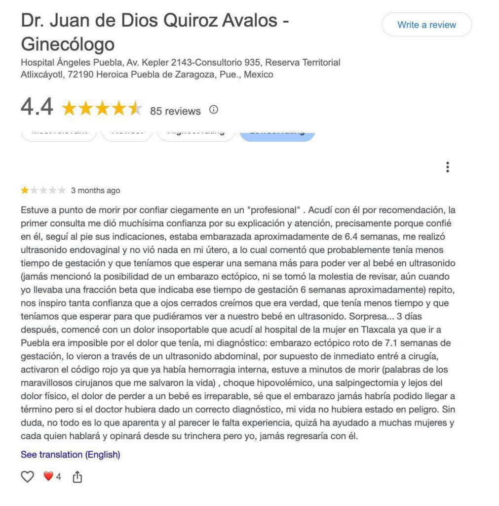 Recientemente salió a la luz una ola de comentarios contra el doctor Juan de Dios Q. A., ginecólogo y obstetra del Hospital Ángeles, realizados por mujeres que aseguraron haber sido sus pacientes y que no lo recomiendan para nada, ya que, supuestamente, más de una ha estado a punto de perder la vida luego de acudir a chequeos con él. Además, varias confirmaron haber estado al borde de perder a sus bebés.